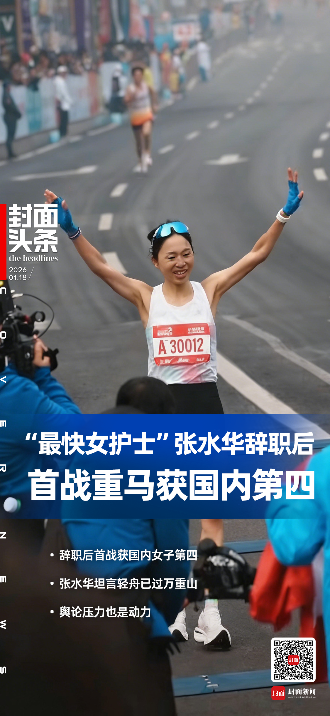 1月18日上午,2026年重庆马拉松在重庆南滨路鸣枪开跑。作为世界田联金标赛事和中国马拉松大满贯赛事,此次赛事吸引了众多国内外实力选手参赛,此前备受争议的“最快女护士”张水华也现身其中。这也是张水华辞职后的首战,完赛成绩2小时30分51秒(最终成绩待官方确认),获国际女子组第六名。